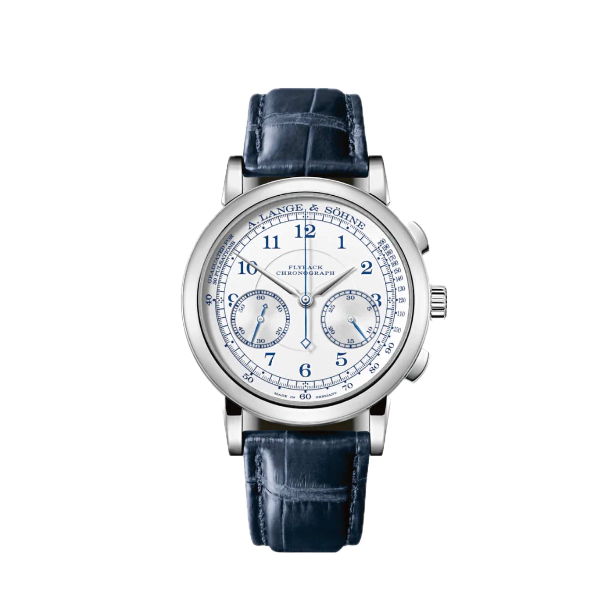 The A. Lange & Söhne 1815 Chronograph 414.026 in white gold is a sophisticated and elegant timepiece that seamlessly blends traditional design with the brand's exceptional craftsmanship. The 39.5mm case is made of 18k white gold, offering a refined and luxurious look that complements the watch's classic aesthetic.