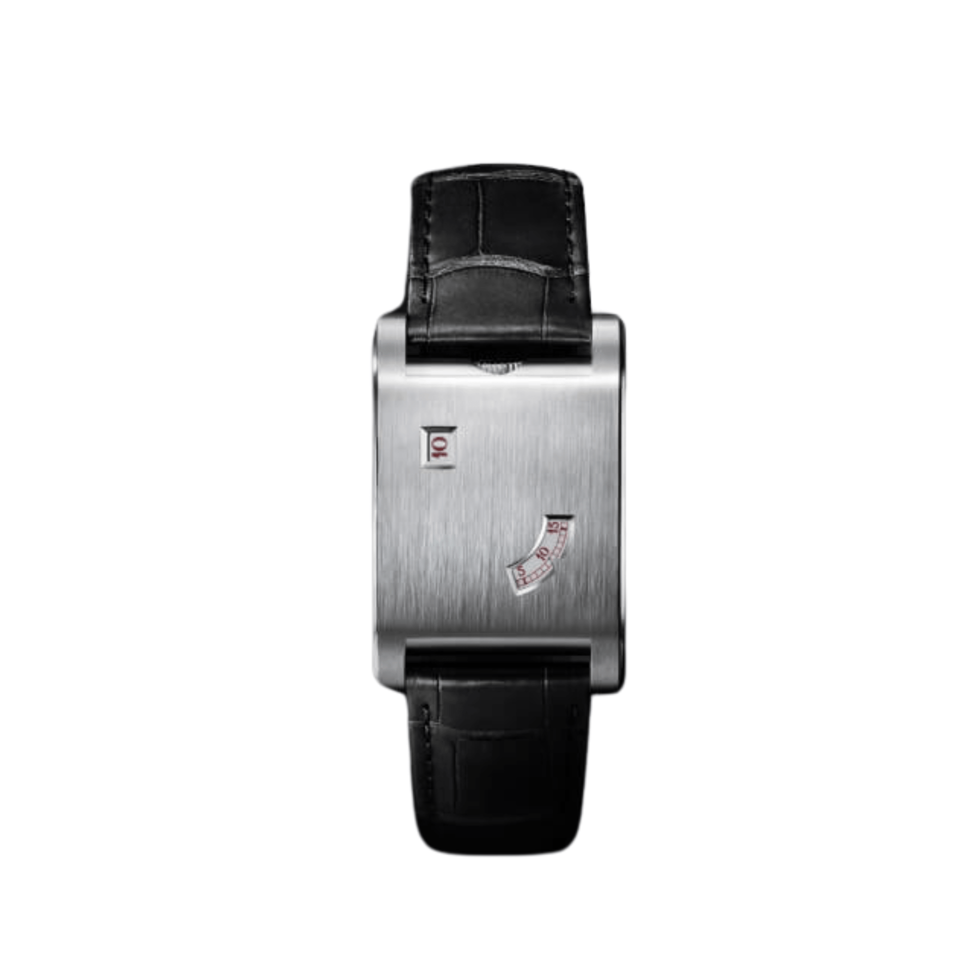 The brushed platinum façade, free of embellishment, puts full focus on form and function, while the angled aperturessubtly modernize the traditional linear layout. A mechanical manual-winding movement powers the jumping hour complication, maintaining the purist spirit of the original while offering a refined tactile experience. Finished with a black alligator leather strap and platinum folding buckle, the WGTA0237 Tank à Guichets is a bold collector’s piece—fusing Cartier's legacy of mystery and minimalism with rare-case material and a forward-looking design ethos.